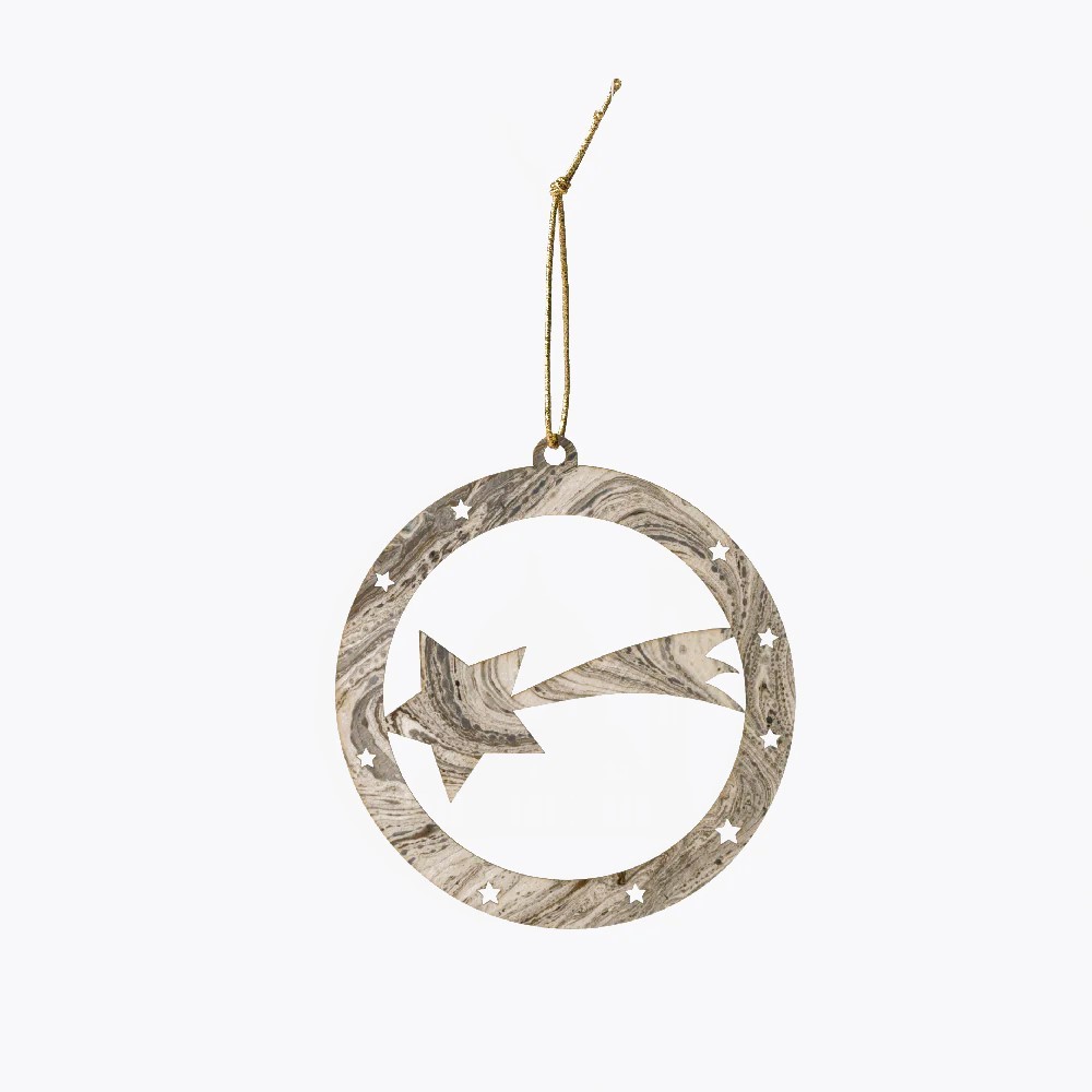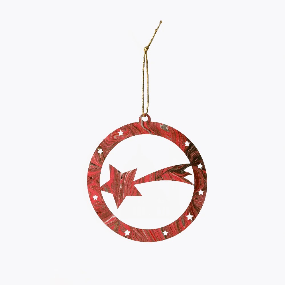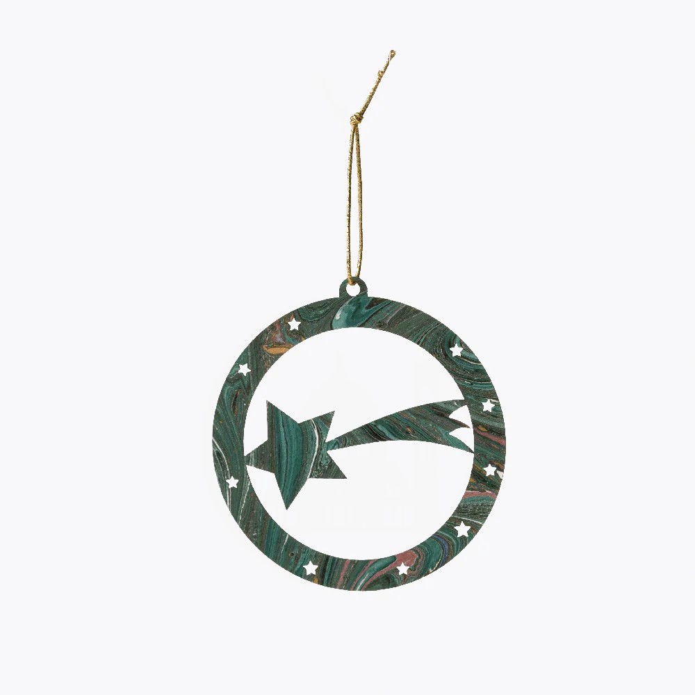 Laser cut, marbled paper Christmas decorations to adorn your tree.