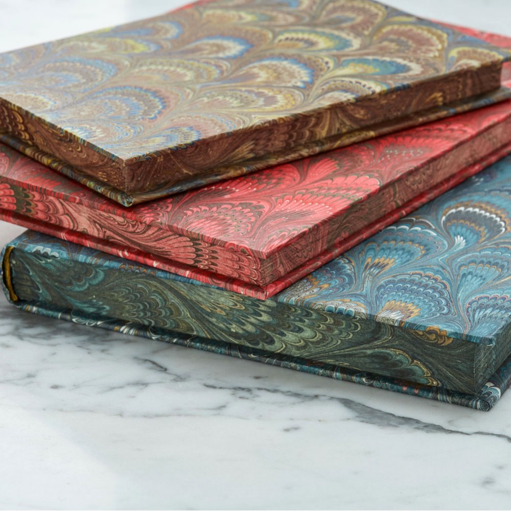 Demonstrating the finest in Italian tradition, the covers and edges of these beautiful hand bound journals are individually decorated, according to 17th Century marbling technique, within our Florentine workshop. Perfectly suited for those who appreciate the art of writing or have the creative flair to draw, our paper journals are bound using the highest quality of plain ivory stock which is watermarked, acid-fee and designed to absorb ink pens. A unique piece, with no two being the same..
