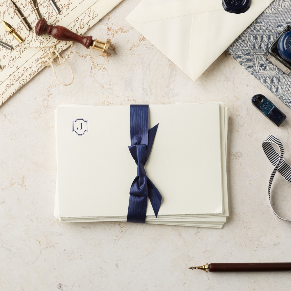 Our timeless range of Ivory hand-made and deckle edge stationery is suitable for writing with ink pens and features an exquisite raised print navy monogram, skillfully hand engraved one at a time by our Florentine artisans in Italy. Reminiscent of a time gone by, our exceptional quality stationery is designed for the person who appreciates the art of writing, the beauty of hand crafted products and for those who still enjoy saying 'Thank you' with the written word. Ideal as invitations to that special occasion.